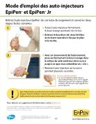 Mode d’emploi des auto-injecteurs EpiPenMD et EpiPenMD JrRetirez l’auto-injecteur EpiPenMD de son tube de rangement et suivez les deux étapes faciles suivantes :• Tenez l’auto-injecteur fermement, le bout orange pointant vers le bas.• Enlevez le bouchon de sécurité bleu en le tirant tout droit. Ne pas le plier ni le tordre.• Avec un mouvement de balancement, poussez fermement le bout orange dans le milieu du côté extérieur de la cuisse jusqu’à ce que vous entendiez un « clic ».• Retenezl’auto-injecteursurlacuisse pendant plusieurs secondes.Couvre-aiguille intégré• Le couvre aiguille orange s’étend automatiquement pour couvrir l’aiguille d’injection quand l’auto-injecteur EpiPenMD est retiré, afin d’assurer que l’aiguille n’est jamais exposée.12!Après l’administration, les patients doivent consulter un médecin immédiatement ou se rendre à la salle d’urgence. Durant les 48 heures suivantes, les patients doivent s’assurer de demeurer à proximité d’un établissement de santé ou d’un endroit d’où ils peuvent composer le 911.Pour obtenir un supplément d’information, visitez EpiPen.ca.Les auto-injecteurs EpiPenMD et EpiPenMD Jr sont indiqués pour le traitement d’urgence des réactions anaphylactiques chez les patients qui présentent des risques accrus d’anaphylaxie, incluant les personnes ayant des antécédents en matière de réactions anaphylactiques. Ce produit peut ne pas vous convenir. Veuillez toujours lire l’étiquette et suivre le mode d’emploi.© 2014 Pfizer Canada inc., Kirkland (Québec) H9J 2M5 • Numéro sans frais : 1-877-EPIPEN1 (1-877-374-7361)EpiPenMD et EpiPenMD Jr sont des marques déposées de Mylan Inc. dont la licence exclusive a été accordée à Mylan Specialty, L.P.,sociétéaffiliéedétenueenpropriétéexclusive;sous-titulaire,PfizerCanadainc.,Kirkland(Québec) H9J2M5 D000046023Éprouvé depuis plus de 25 ans.